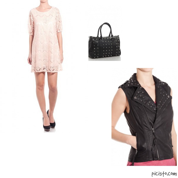 Pentru zi, as purta aceasta minunata rochie de dantela roz in urmatoarea combinatie, mi se pare ca se potriveste de minune. Pe langa dantela, un alt trend este cel al tintelor. Mi se pare perfecta combinatia, rochia mult prea feminina (pentru gustul meu) este echilibrata de pielea cu tinte, atat la geanta, cat si la vesta. O tinuta smart casual, potrivita si adaptabila oricarei situatii.