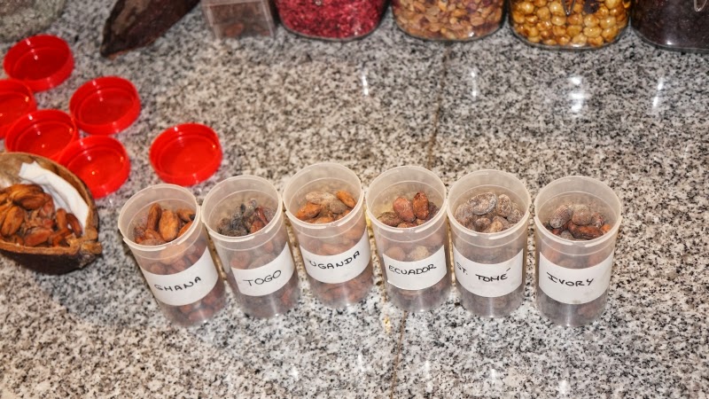 Si incepem cu elementele de baza: o pastaie de cacao si boabe de cacao, in functie de tara de provenienta. Am privit, am mirosit, am gustat.