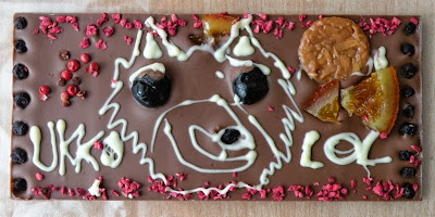 Am ajuns acasa cu ciocolata proprie. Iubitul meu este partea creativa a acestei relatii, cred ca si jobul de grafician l-a ajutat in a-l desena pe Ukko pe tableta de ciocolata. Seamana?