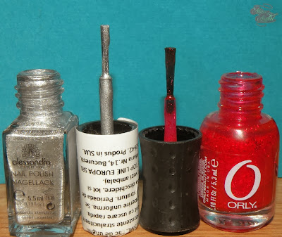 Am ales un rosu festiv – Last Dance de la Orly si un argintiu cromat cu ceva particule sclipitoare, nuanta 74 de la Alessandro, gasite in pungutele primite la #decemberbeautybloggersmeeting2. Ambele se aplica extrem de usor, ma asteptam ca argintiul sa se aplice cu dungi insa m-a suprins extrem de placut. Doua straturi sunt suficiente, se aplica uniform. La Orly se schimba putin treaba, caci este mai degraba un gel usor colorat cu particule rosii. Cred ca ar fi fost necesar sa aplic o baza, insa am aplicat trei straturi si sunt multumita de ce a iesit. Ambele se aplica usor si se usuca repede.