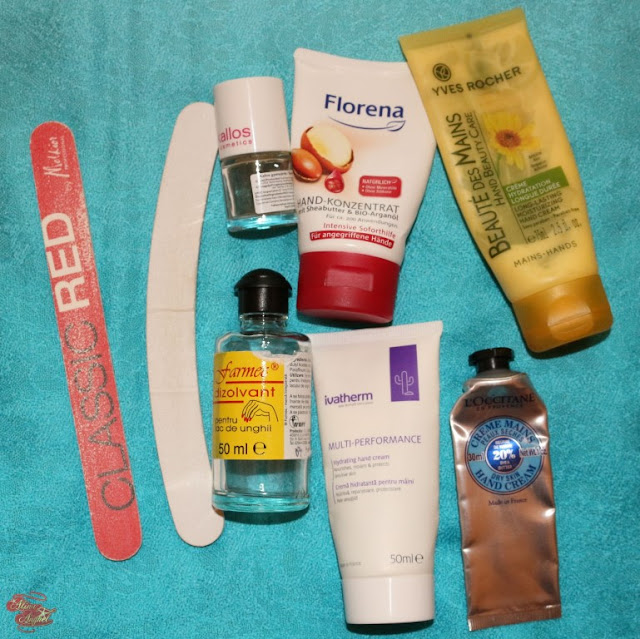 Imi place sa am maini ingrijite (desi la capitolul cuticule nu imi iese de fiecare data, pentru ca nu sunt constanta in a folosi uleiul de cuticule). Folosesc zilnic crema de maini, am inclusiv pe biroul de la munca una. Florena mi-a placut tare mult, era pe baza de silicon si catifela mainile instant. Crema de maini Ivatherm este de folosit, cea cu arnica de la Yves Rocher este printre preferatele mele, la fel si cea cu unt de shea de la L`Occitane en Provence. Am cumparat mai multe tipuri de crema de maini de la ei, insa asta e cea mai hidratanta. Baza de unghii Kallos mi-a placut tare mult, dizolvantul Farmec nu prea, usuca cuticulele. Pila de unghii Melkior e perfecta!