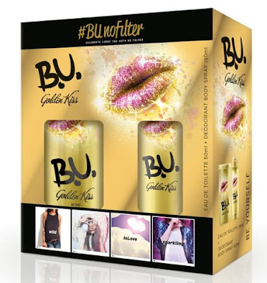 Cea mai recenta lansare din acest an, gama Golden Kiss, isi face debutul in varianta pachetelor in editie limitata de sarbatori. Gama este potrivita pentru starul din fiecare, acea sclipire pretioasa, personala, care izvoraste din magia interioara a fetelor glam B.U. Aroma floral-fructata este redata de primele adieri blande si proaspete compuse din note de mar verde, para dulce si bergamota. In inima puternica a parfumului se regasesc aromele de iasomie senzuala, pruna si violete, iar intreg ansamblul este echilibrat de o baza vanilata, cu atingeri de lemn de santal si mosc.