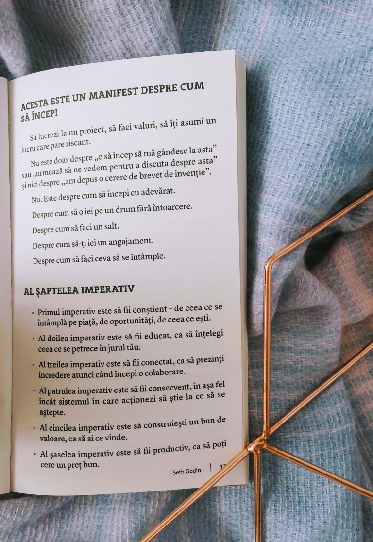 Cartea este una destul de complexa, mi-ar fi greu sa o incadrez intr-un tipar anume. Marketing sau dezvoltare personala, poate si un pic de psihologie, este un mic tratat de valoare ce te indeamna sa faci ceva! Nu e importanta varsta sau ocupatia, ceea ce conteaza este sa nu astepti sa se intample miracole, ci sa ai curajul sa pornesti la drum. Iti schimba perspectivele si te faci sa vezi care este miza jocului, ce poti pune valoros pe masa. Munca ar trebui sa fie o placere, nu locul unde ne pierdem minim 8 ore pe zi doar pentru a castiga un salariu care oricum nu ne acopera necesitatile. Nu degeaba se spune: Fa ceea ce iti place si nu va mai trebui sa muncesti nicio zi. Te-ai gandit vreodata cat de importanta e viata ta pentru a nu o irosi zilnic?